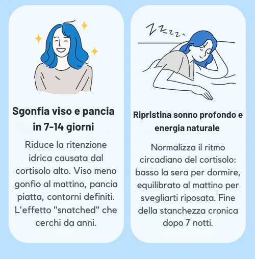 Lo stress porta a un rilascio costante di cortisolo – un ormone che aumenta l'appetito e il desiderio di cibi ricchi di grassi e zuccheri. Il cortisolo rallenta anche il metabolismo, rendendo più difficile perdere peso e spesso portando a un aumento di peso. Nellio contiene Ashwagandha, che aiuta a regolare i livelli di cortisolo, riducendo così le voglie e riportando in equilibrio il metabolismo.
