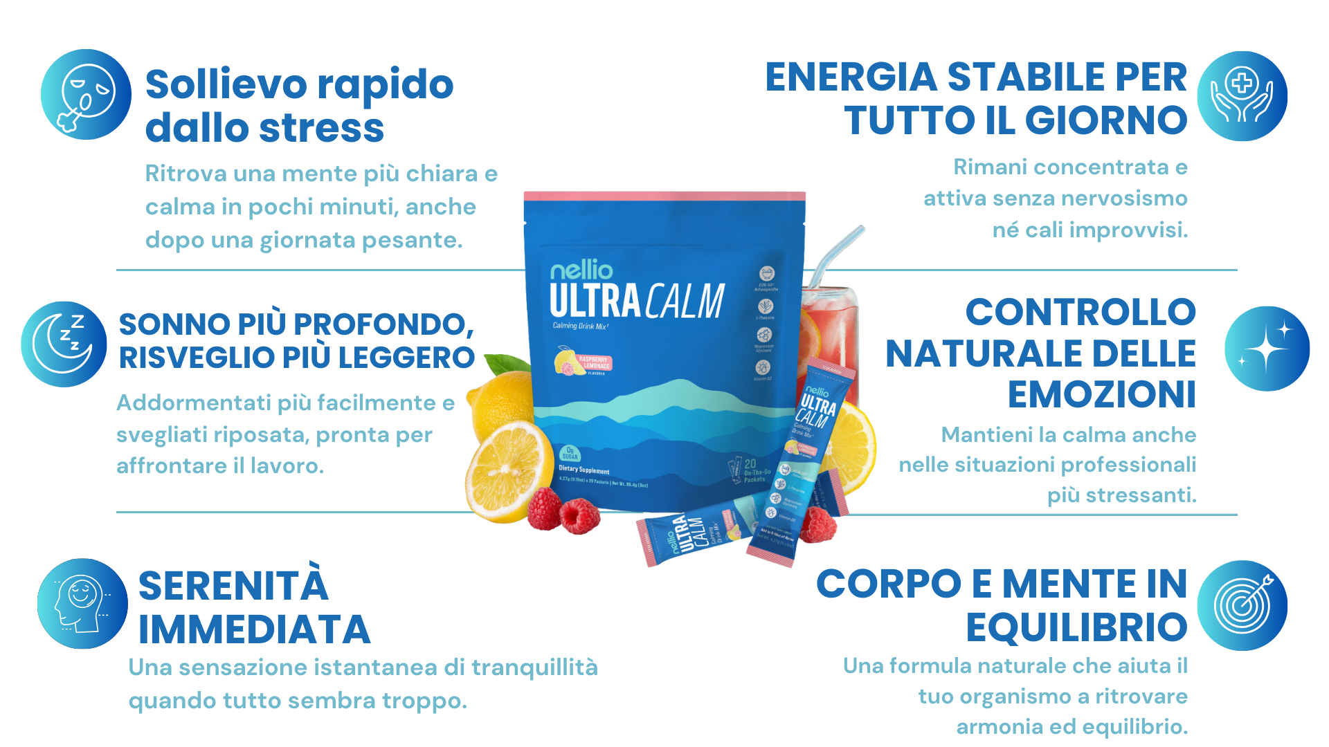 IMPORTANTE L’originale UltraCalm è venduto esclusivamente da Nellio. Non possiamo garantire la qualità né la sicurezza degli integratori alimentari con confezioni simili acquistati altrove. Per assicurarti di ricevere un prodotto testato e sicuro, ordina solo qui, sul nostro sito ufficiale.