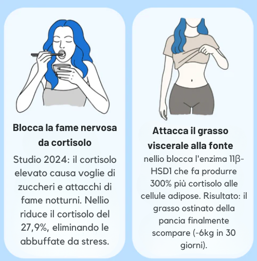 Lo stress porta a un rilascio costante di cortisolo – un ormone che aumenta l'appetito e il desiderio di cibi ricchi di grassi e zuccheri. Il cortisolo rallenta anche il metabolismo, rendendo più difficile perdere peso e spesso portando a un aumento di peso. Nellio contiene Ashwagandha, che aiuta a regolare i livelli di cortisolo, riducendo così le voglie e riportando in equilibrio il metabolismo.